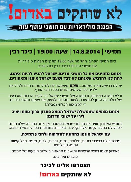 ביום ה' (14.08.14) התקיימה בכיכר רבין בתל אביב הפגנת הזדהות עם תושבי עוטף עזה. אלי אסקוזידו עודד את תושבי נחל שורק להגיע ולהפגין סולידאריות עם תושבי הדרום. תושבי מועצה רבים נענו לקריאה והגיעו בהמוניהם להשתתף בהפגנה. המשתתפים ביטאו את הציפייה שלהם מממשלת ישראל כי יימצא פתרון לטווח ארוך לבעיית הירי על תושבי עוטף עזה ותושבי הדרום. כמו כן, הייתה ההפגנה הזדמנות להוקיר תודה לכל אחד ואחת במדינת ישראל אשר נרתמו לעזור לתושבי הדרום במצב הקשה שאליו נקלעו. במהלך האירוע נשאו דברים ראשי רשויות וכן תושבים מהדרום, זאת לצד הופעות של אמנים אהובים על כל עם ישראל.